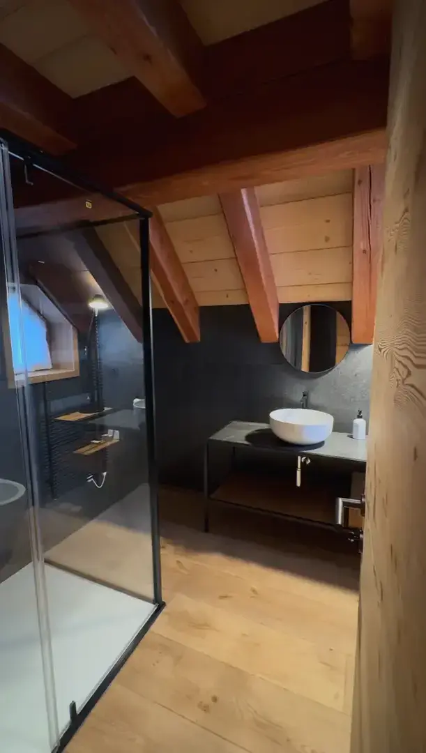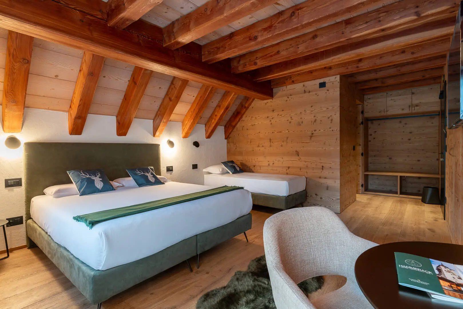 Nestled in the heart of the Malborghetto mountains, the Deluxe Triple Room blends comfort, elegance, and contemporary design. Oak flooring, thermo-treated larch wood walls, and custom minimal furnishings create a refined and welcoming atmosphere. The bathroom, featuring wood and black stone-effect tiles, ensures maximum comfort. Completing the experience is a private terrace with mountain view, perfect for enjoying a drink in total relaxation.