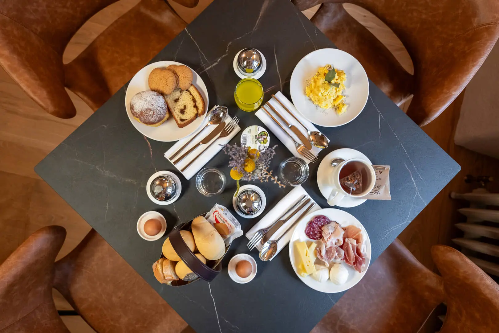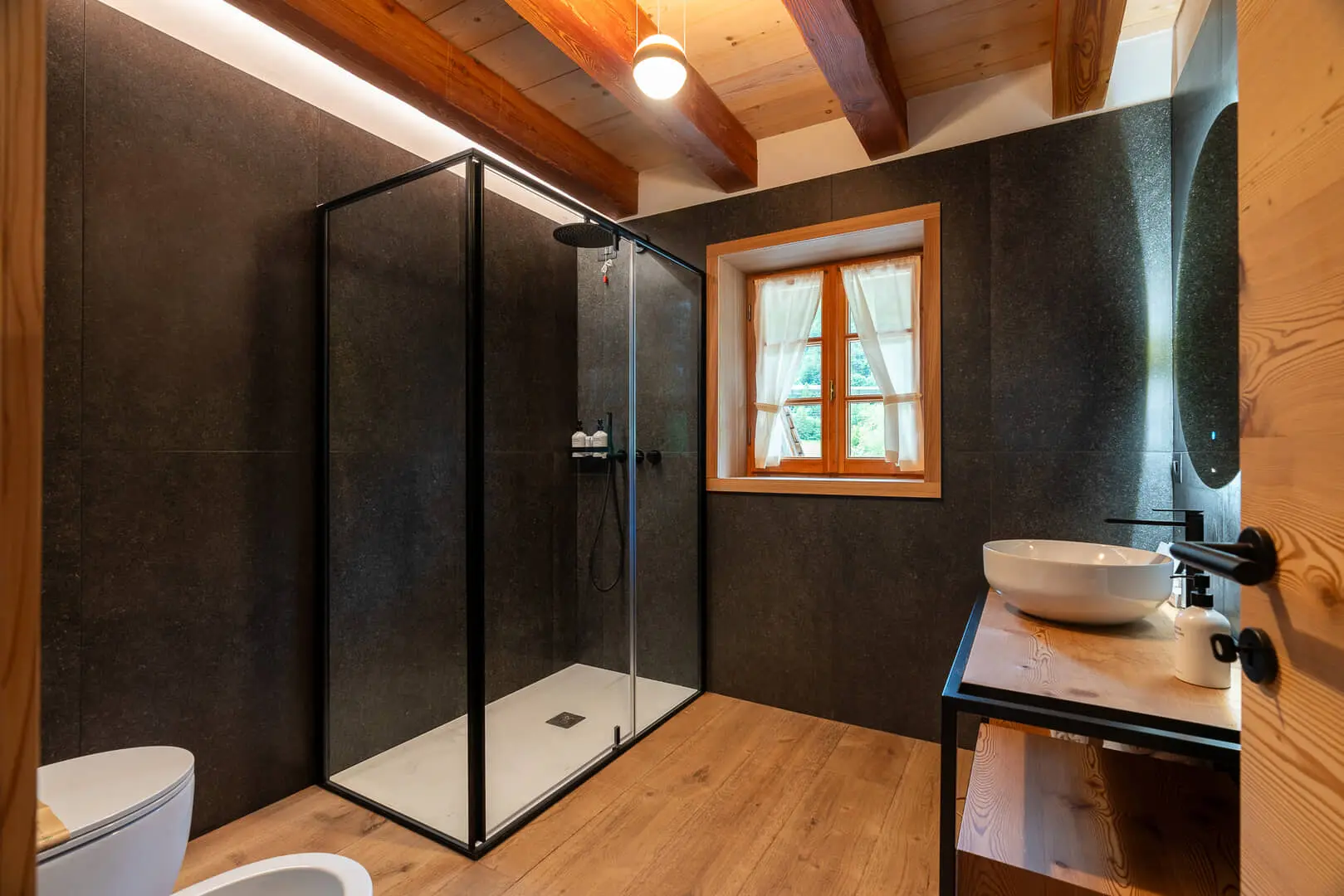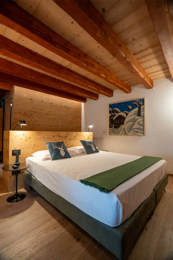 Wrapped in the warmth of wood and the quiet of the Carnic Alps, the Junior Suite welcomes guests with elegance and intimacy. The covered terrace with mountain view invites relaxation, while the cosy sitting area, furnishings in larch wood, and the spacious bathroom with shower create a welcoming and comfortable atmosphere. A place where time slows down and the senses come alive.