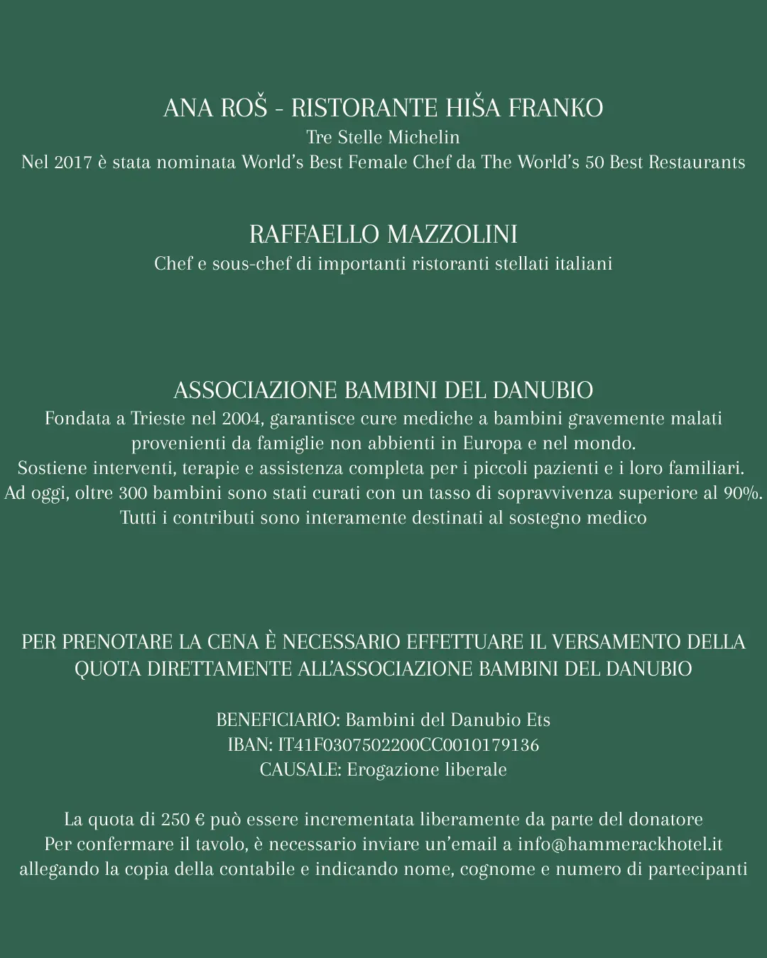 Una serata di alta cucina e solidarietà: l’intero ricavato sarà devoluto all’Associazione Bambini del Danubio ETS, attiva dal 2004 nel sostegno a cure e interventi specialistici per bambini.